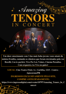 Um show emocionante com 3 das mais belas jovens vozes atuais da música Erudita, cantando os clássicos que foram eternizados pela voz Bocelli, Con te partiró, Vivo Per Lei, Volare, Cinema Paradiso. Com orquestra Ao Vivo no palco! Compras de ingressos e informações exclusivamente pelo site: https://www.ingressodigital.com/evento/10797/Amazing_Tenors_In_Concert