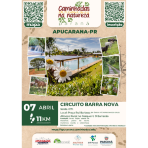 Que tal visitar Apucarana para uma Caminhada Rural?! No dia 07 de ABRIL acontecerá o CIRCUITO BARRA NOVA, saída a partir das 07:00h, na Praça Valmor Santos Giavarina, Praça da Onça (De Ônibus até as Piscinas do Grilo). Inscrições: https://apucarana.caminhadas.info/ Almoço Rural no Pesqueiro O barracão, cardápio: Arroz, Feijão, Salada de macarrão, Porco no tacho, Mandioca cozida e sobremesas. Bebidas a parte. (valores e demais informações através da inscrição).